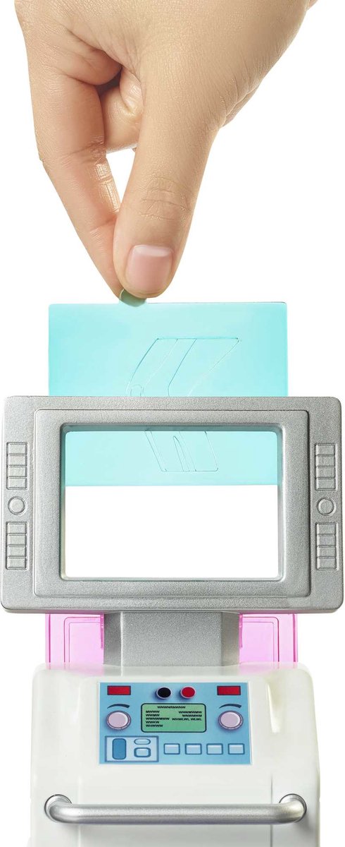 Pour une pause, visitez la boutique de souvenirs colorée pour acheter un cadeau ou une collation ! Certains accessoires sont dotés d'une pince permettant à Docteur Barbie® de les tenir pour un jeu encore plus réaliste !